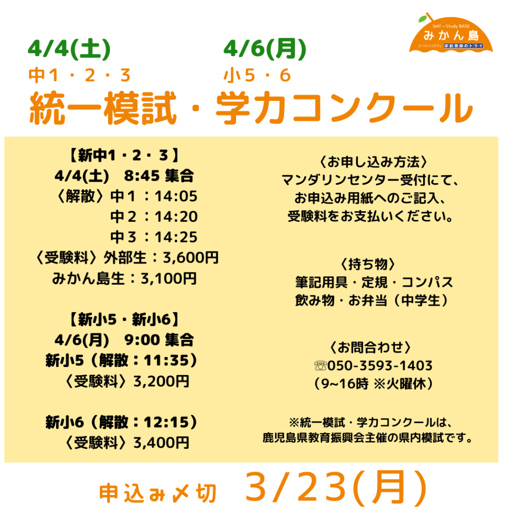 【新小5~中3春期模試 〆切3/23(月)】